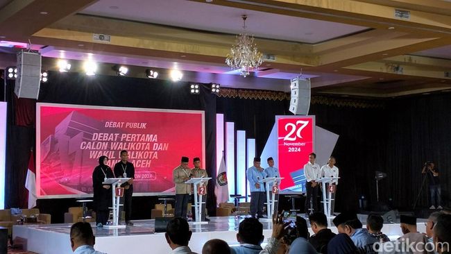 Pantauan detikSumut, debat pertama digelar di Hotel Amel Convention Hall, Banda Aceh, Rabu (30/10/2024) malam. Keempat pasangan calon yang mengikuti debat adalah pasangan Illiza Sa'aduddin Djamal-Afdhal Khalilullah Mukhlis, Zainal Arifin-Mulia Rahman, Aminullah Usman-Isnaini Husda, dan Teuku Irwan Djohan-Khairul Amal.