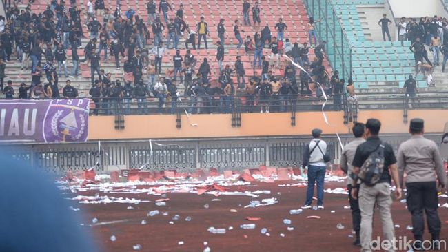 Tampak kursi penonton dicopot secara paksa dan dilempar ke dalam lapangan. Suasana yang panas pun kembali reda setelah Kapolresta Pekanbaru, Kombes Pria Budi mengimbau untuk tenang dan damai.