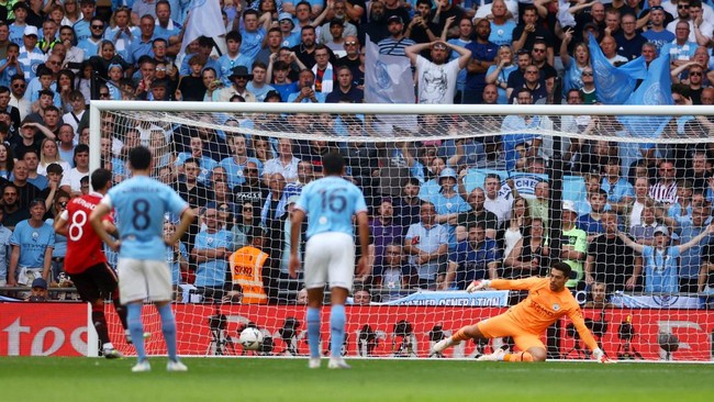Pertandingan Final Piala FA antara Manchester United vs Manchester City di babak pertama telah tuntas. Kedua tim masing-masing mencetak satu gol.