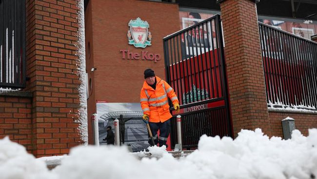 Merseyside, Inggris, dilanda salju. Cuaca ekstrem ini tidak membuat pertandingan Liverpool vs Manchester United ditunda.