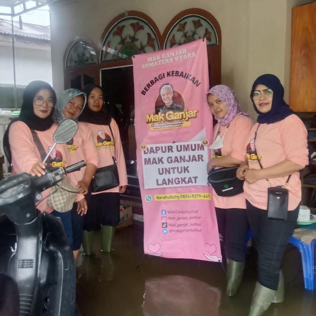 Relawan pendukung Ganjar Pranowo, Mak Ganjar Sumatera Utara (Sumut) mendirikan dapur umum dan membagikan ratusan nasi kotak kepada korban banjir di Jalan Syekh Usman, Gang Bilal dan Kampung Dalam Tanjung Pura, Kabupaten Langkat, Sumut. Mereka membagikan makanan secara door to door kepada para korban banjir.