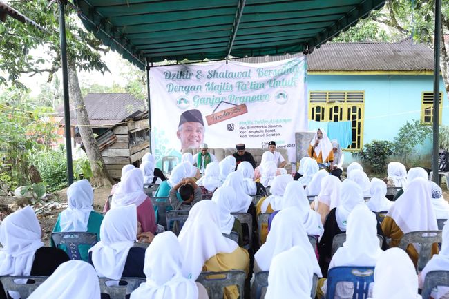 Sukarelawan Tuan Guru Sahabat Ganjar menggelar zikir dan selawat di Majelis Taklim Al-Akhyar, Kelurahan Simatorkis Sisoma, Kecamatan Angkola Barat, Kabupaten Tapanuli Selatan, Sumatera Utara, Senin (13/3). Dalam kunjungan ini, para relawan juga memberikan bantuan sarana dan prasarana penunjang kegiatan majelis taklim.