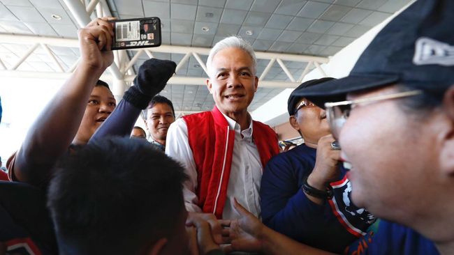Kedatangan bakal calon presiden PDI-P Ganjar di Bandara Sultan Mahmud Badaruddin, Palembang, Sumatera Selatan hari ini disambut ratusan pendukung. Mereka terlihat antusias dengan kedatangan Ganjar dan terus meneriaki namanya.