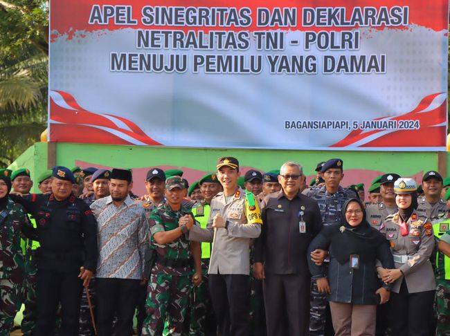 Polres Rokan Hilir dan Kodim 0321 Rohil menggelar apel sinergitas dan deklarasi netralitas TNI-Polri. Apel digelar di Makodim Rohil.