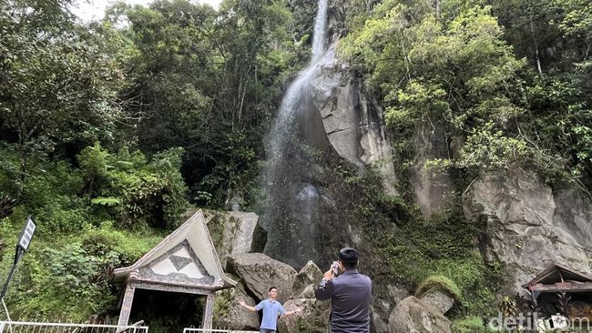 Tim detikSumut pun mencoba mendatangi Air Terjun Sampuran Na Pitu di Kabupaten Samosir, Minggu (16/12/2024). Percikan air terjun ini membuat suasana menjadi sejuk.