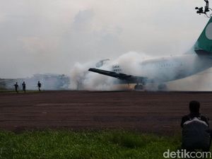 Menegangkan. Simulasi keributan yang berbuntut terbakarnya pesawat di Landasan Udara Bandara Husein Sastranegara dibuat seolah terjadi.