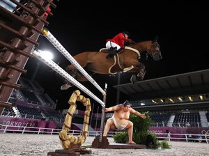 Atlet berkuda di Olimpiade Tokyo 2020 mengeluh kepada pihak panitia. Ngapain, sih, ada patung sumo di arena? Kuda-kuda jadi takut nih!