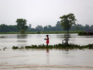 Banjir merendam kawasan India dan Bangladesh. Banjir imbas badai monsun itu mengakibatkan warga ramai-ramai mengungsi ke tempat yang lebih aman.