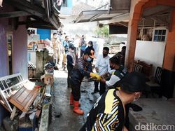 Mimi (50) mengusap dadanya seraya membersihkan sejumlah peralatan jualannya yang porak-poranda dihantam banjir. Warungnya ini langganan para pesohor.