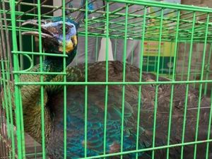 Burung merak hijau nyasar ke permukiman di Bojongsoang, Bandung. Setelah ditangkap warga, merak diserahkan ke BBKSDA Jabar untuk penanganan lebih lanjut.