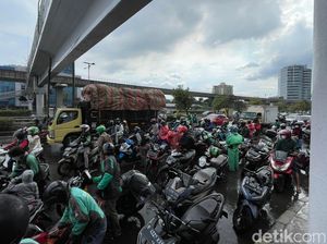 Sejumlah titik di DKI Jakarta terpantau hujan siang ini. Beberapa pemotor ada yang berteduh sampai memakan jalan.