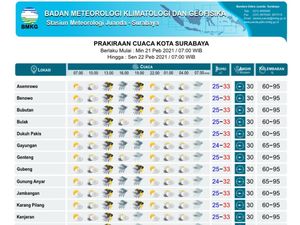Surabaya diprakirakan akan diguyur hujan disertai petir pada siang hingga malam hari. Namun pagi tadi cenderung cerah dan berawan.
