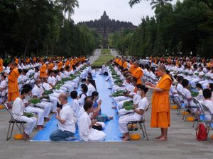 Ribuan umat Budha di Maha Vihara Dharmakirti Palembang melakukan Pradiksana dan puja bakti menyambut hari raya Waisak 2.568 Budhisera.
