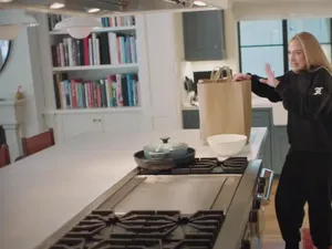 Penyanyi asal Inggris, Adele, memiliki rumah bak istana mungil. Begini dapurnya luas dan sangat elegan dengan perpaduan warna putih dan biru.