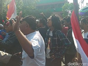 Massa tolak deklarasi #2019GantiPresiden menuntut bertemu Ahmad Dhani. Mereka meminta agar Dhani pergi dari Surabaya. Namun niat mereka dicegah polisi.