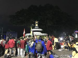 Massa yang terdiri dari mahasiswa, buruh, petani hingga pengemudi ojek online memutuskan untuk bertahan di Tugu Adipura, Kota Sukabumi.