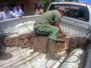 BKSDA Jambi mengevakuasi seekor buaya muara jantan dengan panjang 2,98 meter. Buaya tersebut akan dibawa ke tempat penyelamatan satwa di Tanjungjabung Timur.
