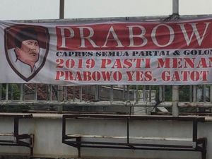 Spanduk Prabowo Subianto sebagai capres 2019 terpampang di JPO di Jalan Matraman Raya, Jakarta Timur. Spanduk itu dukungan untuk Prabowo tapi versus Gatot.