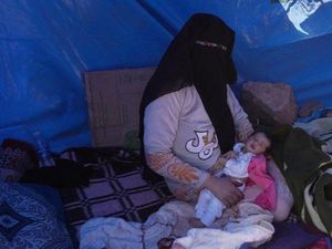 Khadijah dan bayinya yang baru lahir terpaksa tinggal di tenda di pinggir jalan utama karena rumah mereka hancur akibat gempa.