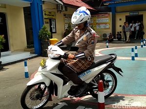 Di depan para pemohon SIM, polisi memperagakan materi safety riding dengan mengenakan sarung. Petugas yang awalnya memakai peci pun menggantinya dengan helm.