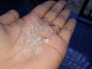 butiran-butiran es jatuh dari langit ke halaman rumah. Butiran es tersebut berukuran kelereng.