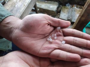 Hujan es yang turun hampir sebesar 'kelereng' itu terjadi Kecamatan Solokanjeruk, Kabupaten Bandung.