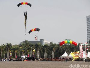 Acara HUT ke-78 Bhayangkara hadirkan 400 gerobak makanan di Monumen Nasional. Aneka kuliner mulai dari ketoprak hingga kerak telor dijajakan secara gratis.
