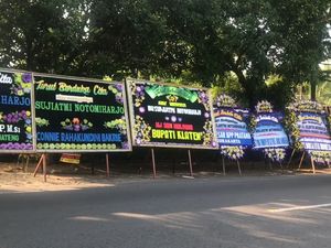 Begini suasana di sekitar rumah duka ibunda Presiden Joko Widodo (Jokowi), Sudjiatmi Notomiharjo. Karangan bunga dari berbagai tokoh 'membanjiri' rumah duka.