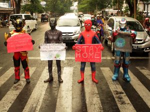 Sejumlah relawan menggunakan kostum "Super Hero" saat melakukan kampanye melawan COVID-19 di Makassar, Sulawesi Selatan.