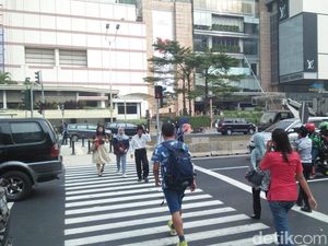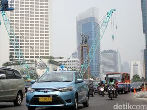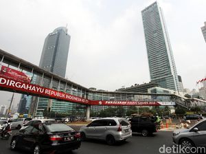 Patung Selamat Datang terhalang bangunan. Dulu, Patung Selamat Datang terhalang JPO dan akhirnya dirobohkan Anies. Kini, patung itu terhalang oleh Halte TransJ.