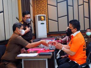 Mereka dikawal oleh sejumlah jaksa dan juga anggota Provost Polri. Mereka mengenakan rompi tahanan merah dan kedua tangannya diborgol.