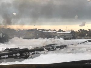 Saat ini tim emergency sedang mengarahkan pengaturan orientasi peralatan fire fighting dengan sasaran tangki T-301F yang masih menyisakan api.