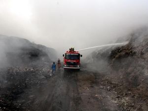 Gunungan sampah di TPA di Belitung terbakar lebih dari 24 jam. Petugas kesulitan memadamkan api karena titik api sudah berada di bagian dalam gunung sampah.