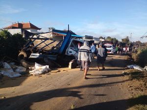 Sebuah truk pengangkut pasir terjungkal dan terbalik di Jalan Raya Kedisan-Penelokan, Desa Kedisan, Kecamatan Kintamani, Bangli, Selasa, (6/02/2024).