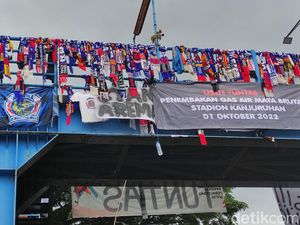 Ratusan syal Arema diikat di Jembatan Jalan Ahmad Yani, Kota Malang. Hal itu merupakan bentuk duka cita Aremania atas Tragedi Kanjuruhan.
