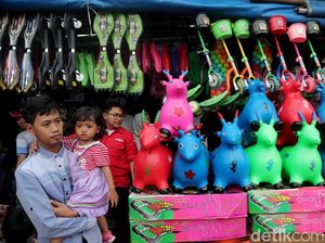 Musim libur Lebaran sejumlah warga Jakarta mengajak buah hati mereka untuk berbelanja di kawasan Pasar Gembrong. Disana dijual berbagai macam mainan.