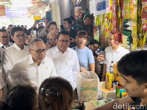 Menteri Pangan Zulkifli Hasan meninjau harga bahan pokok di Pasar Pabaeng-baeng, Makassar. Harga stabil, namun cabe dan minyak masih di atas HET.