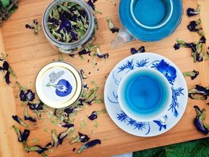 Teh dan beberapa makanan ini disajikan dengan warna biru yang cantik. Dibuat dari campuran bunga telang, lihat nih 10 sajian cantik dengan warna biru.