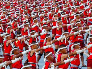Sebanyak 3.660 orang memperagakan aksi bela diri Muay Thai di Taman Rajabhakti, Thailand. Aksi ini pun memecahkan rekor dunia.