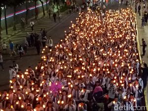 Dengan tertib mereka membawa obor elektrik keliling pusat Kota Jakarta dari Jalan Medan Merdeka Barat menuju Bundaran HI.