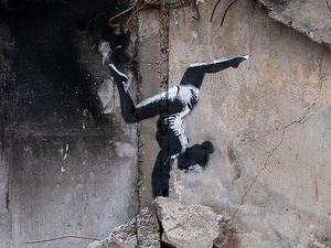 Seniman jalanan asal Bristol, Banksy, memulai debutnya di Ukraina lebih tepatnya di kota Borodyanka, di dinding bangunan yang hancur lebur karena perang.