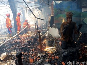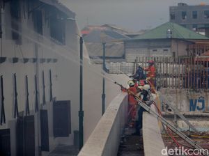Gubernur DKI Anies Baswedan melihat langsung proses pemadaman api di Museum Bahari. Dia mengenakan masker, karena saat ia datang, asap masih membubung.
