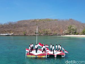Ratusan warga Desa Pantai Oa merayakan HUT ke-79 RI dengan upacara di tengah laut. Camat Freddy Moat Aeng mengajak masyarakat tangguh hadapi erupsi.