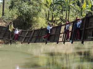 Pelajar dan warga di Sukabumi terpaksa melintasi jembatan miring yang rusak dan berbahaya setiap hari. Permintaan perbaikan jembatan telah diajukan.