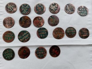 Beberapa koin bertulis VOC dengan angka tahun 1790, bertulis Nederland Indie berangka 1826, India Batavia tahun 1803. Koin terbuat dari bahan kuningan.