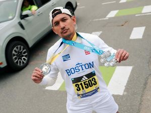 Aktor Ibnu Jamil menyelesaikan Sydney Marathon dengan bangga, ditemani putrinya Yaya. Sepatu unik berhiaskan coretan Yaya jadi simbol dukungan keluarga.