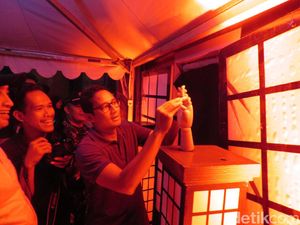 Sandiaga Uno berkunjung ke Festival Jepang di kawasan Blok M, Jakarta Selatan. Dia menulis kata 'Sandi-Djarot' dalam huruf Jepang.