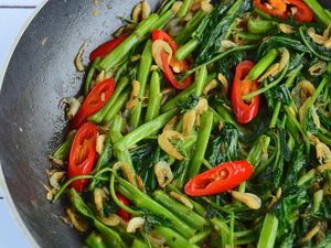 Kangkung yang sederhana selalu bisa jadi lauk enak dan segar. Kali ini dipadukan dengan ayam cincang, terasi dan cabe. Makin sedap renyah dan enak!