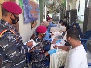 Sekitar 400 warga Grati-Pasuruan antre vaksinasi di Puskesmas Lekok. Vaksinasi 19 yang digelar Puslatpur Marinir Grati, gratis dan diikuti beberapa desa.