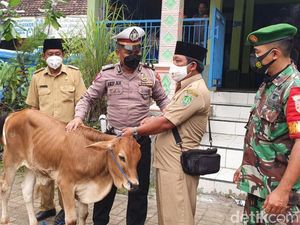 Polres Pasuruan mengadakan vaksinasi COVID-19 berhadiah anak sapi. Warga yang beruntung adalah Sujud, pencari rumput asal Desa Ampelsari, Kecamatan Pasrepan.